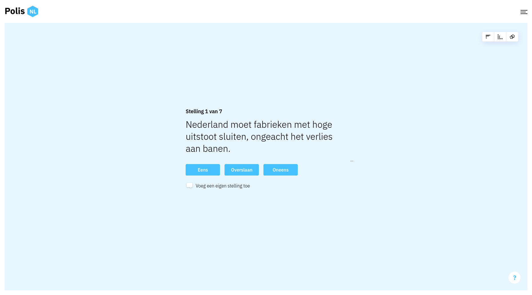 In plaats van te discussiëren op sociale media, reageren deelnemers op stellingen door aan te geven of ze het eens, oneens zijn of geen mening hebben.
